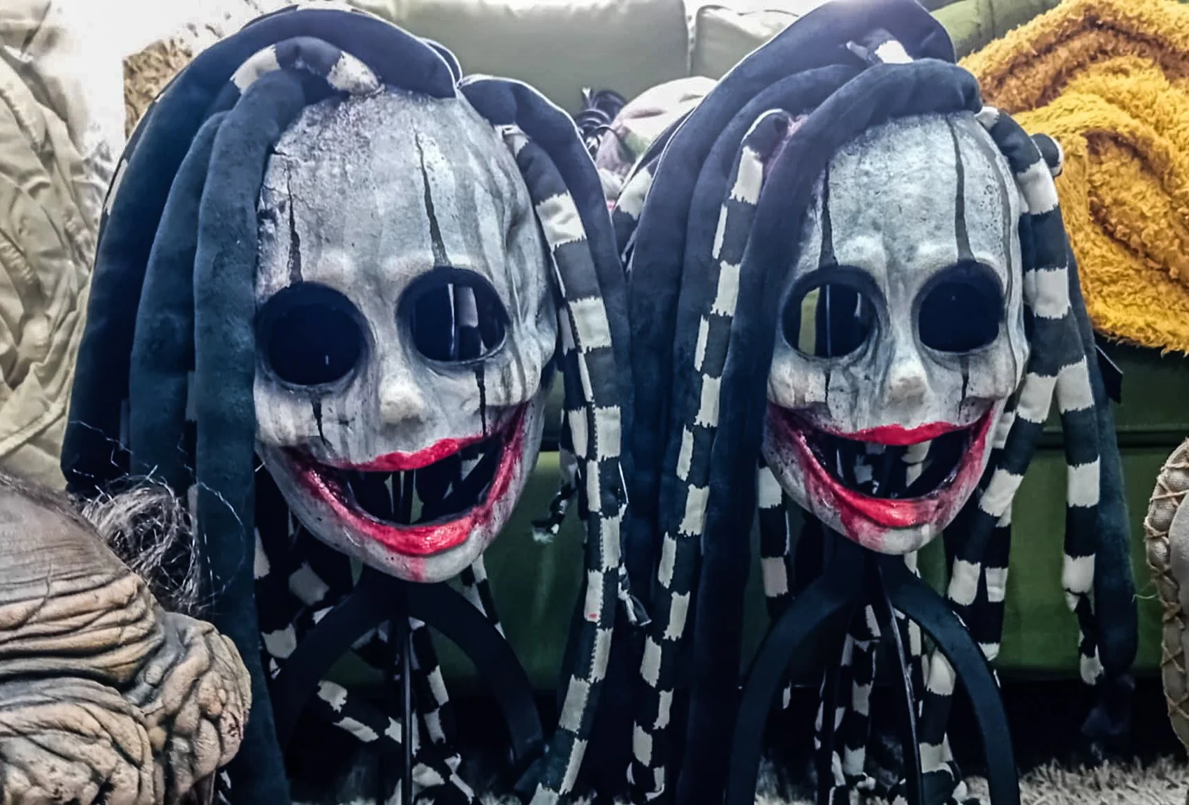Next up we’ve something truly unique. Those who are fans of Tim Burton style animations, we’ve got a Tim Burton inspired Halloween act just for you! Meet the Burton Twins. Spooky and stunning, ethereal and creepy. This twinned doll like act tick all the boxes for Halloween party entertainment. They’re currently in the workshop but here’s a sneak peak of their finished heads! Book this creepy Halloween twin duo to really creep your guests out. Super creepy Halloween entetainment for all types of Halloween parties, Halloween parades and as scare walk entertainment.